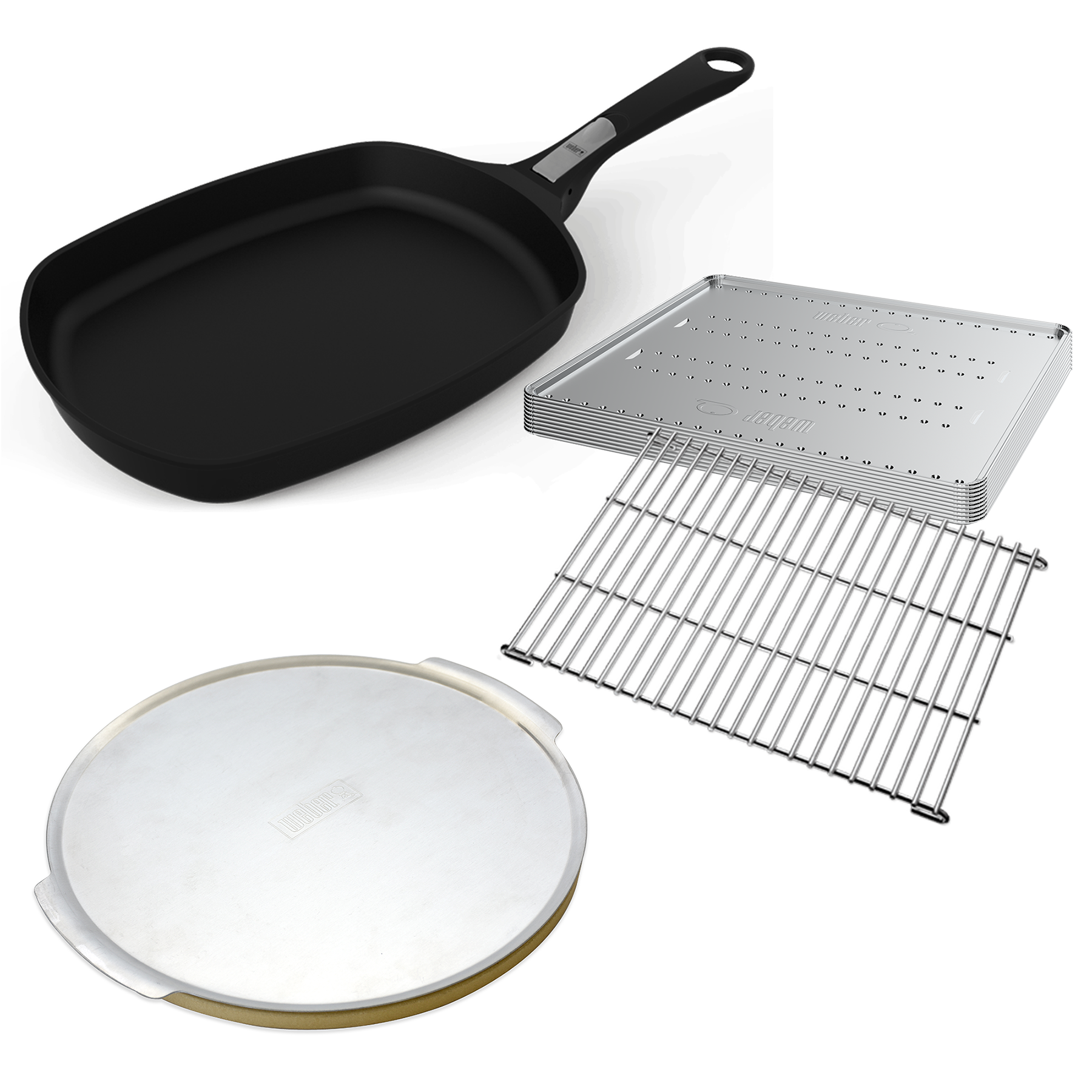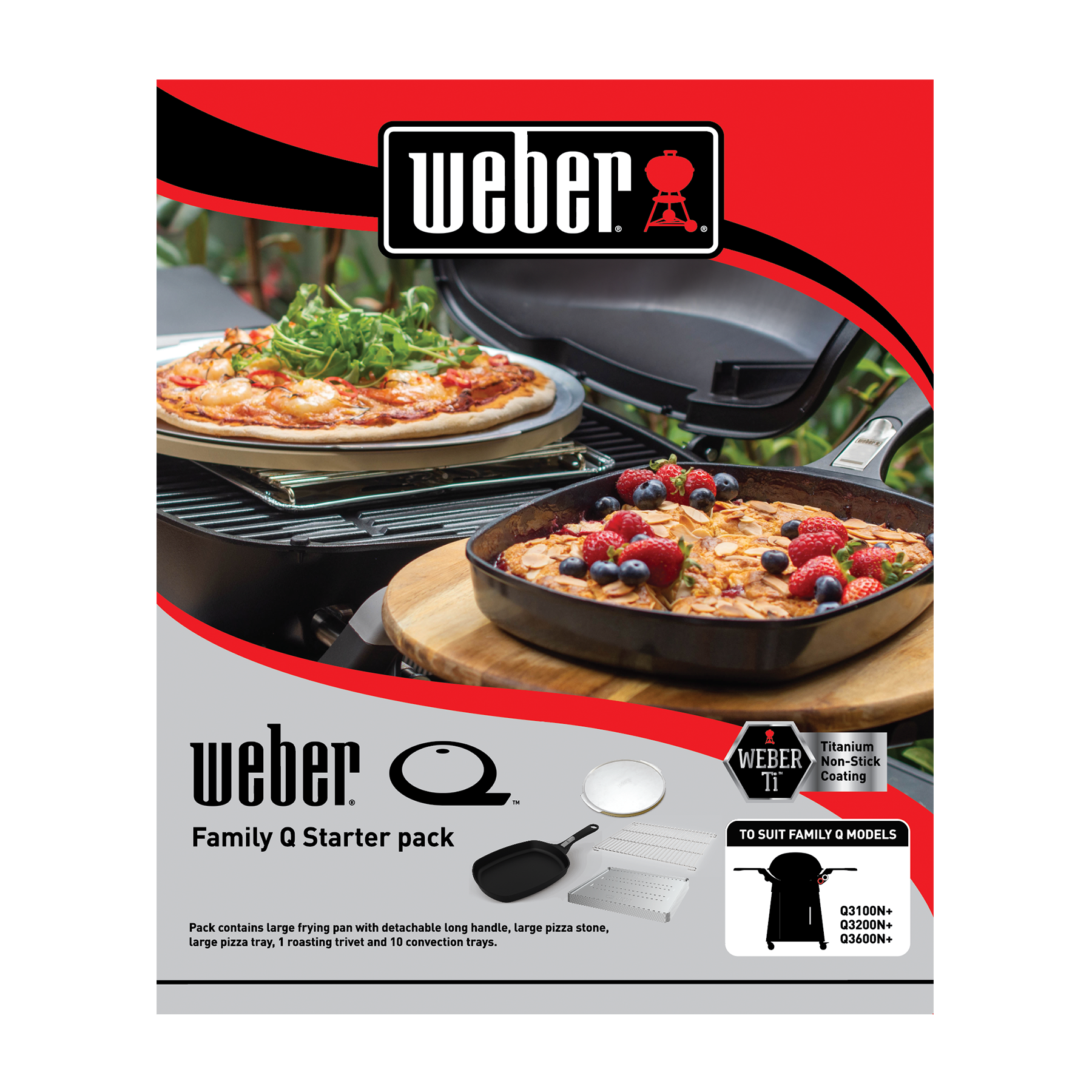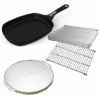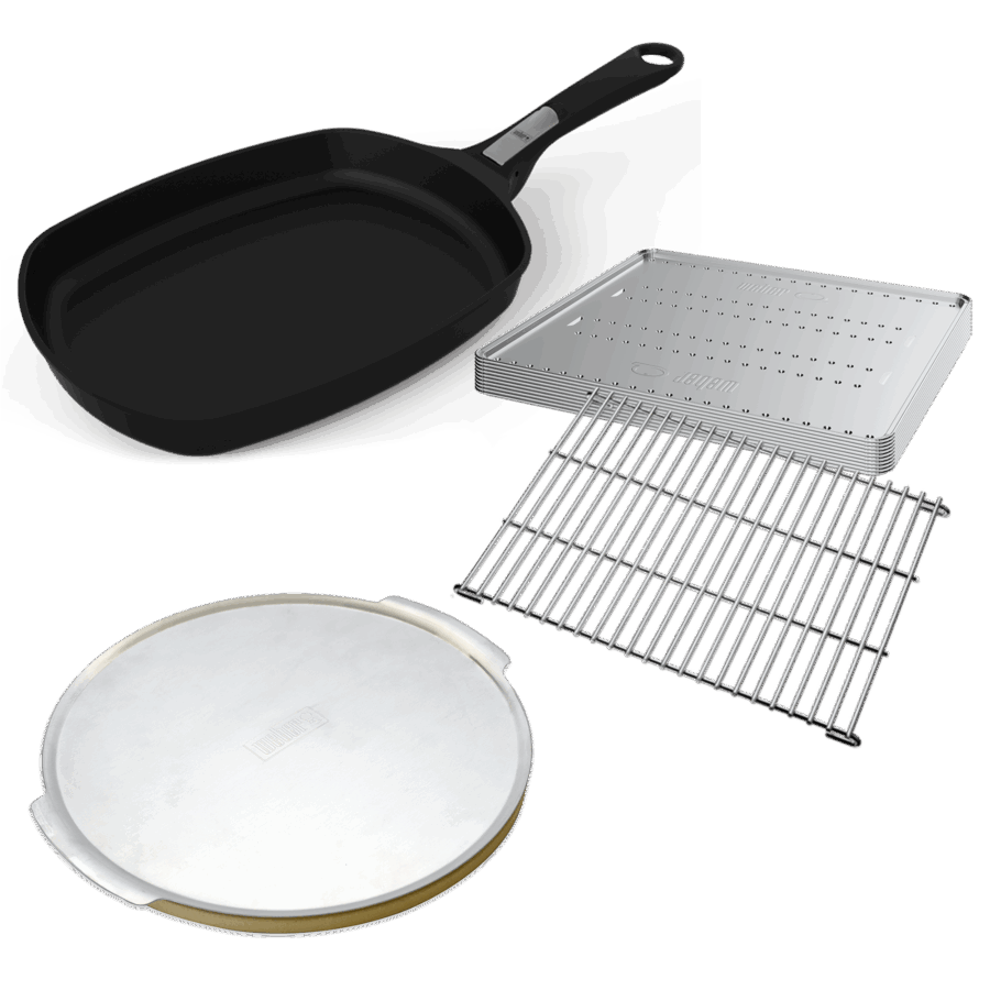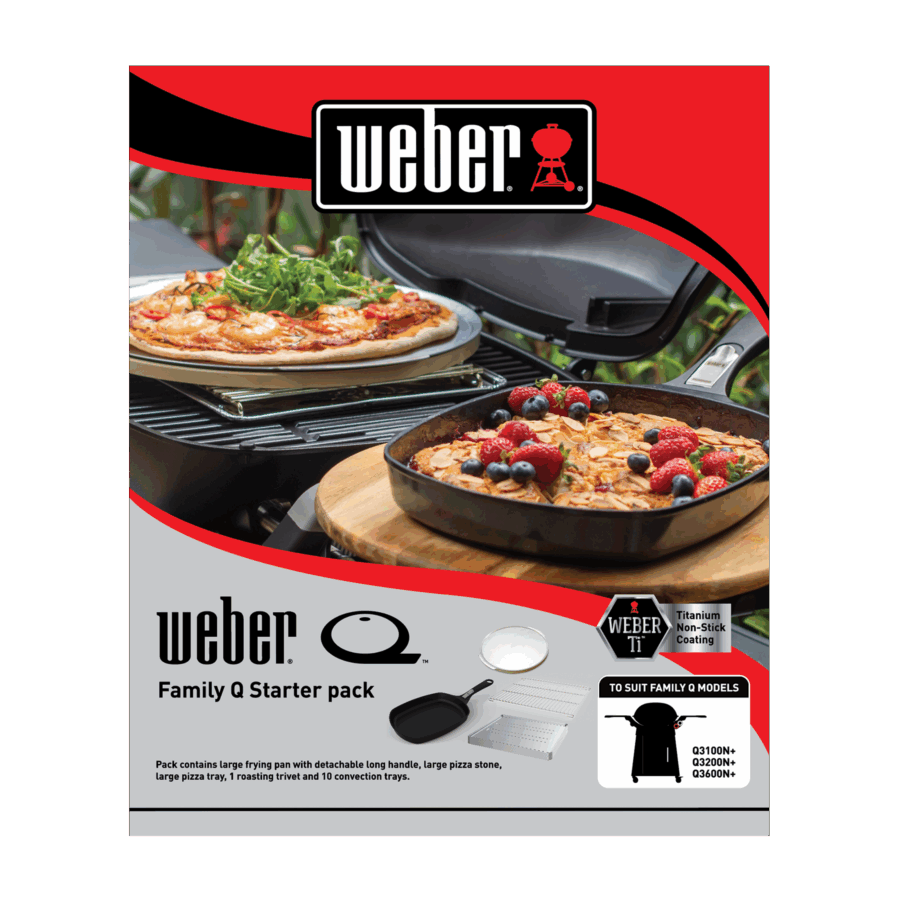 Explore a range of cooking possibilities with this starter pack for your Family Q barbecue. Whether you’re frying eggs and pancakes for breakfast, baking a brownie for morning tea, cooking up a pizza for lunch or roasting a chicken for dinner, this starter pack has all you need. This pack features a roasting trivet and 10 convection trays, a pizza stone with pizza tray and a frying pan with detachable handle – all specially designed and tested for use in your Family Q gas BBQ.