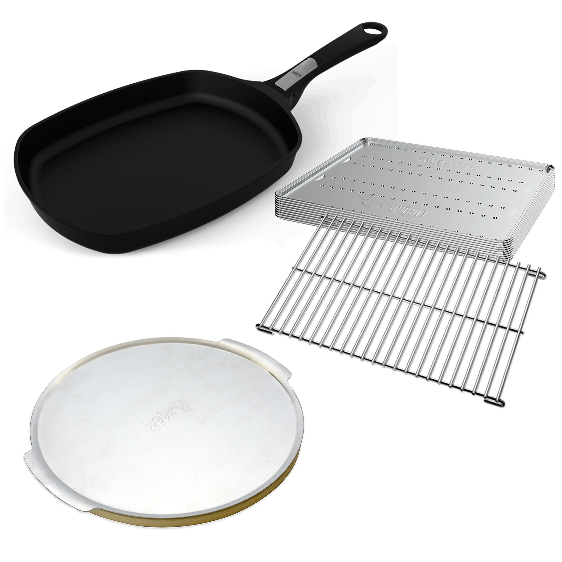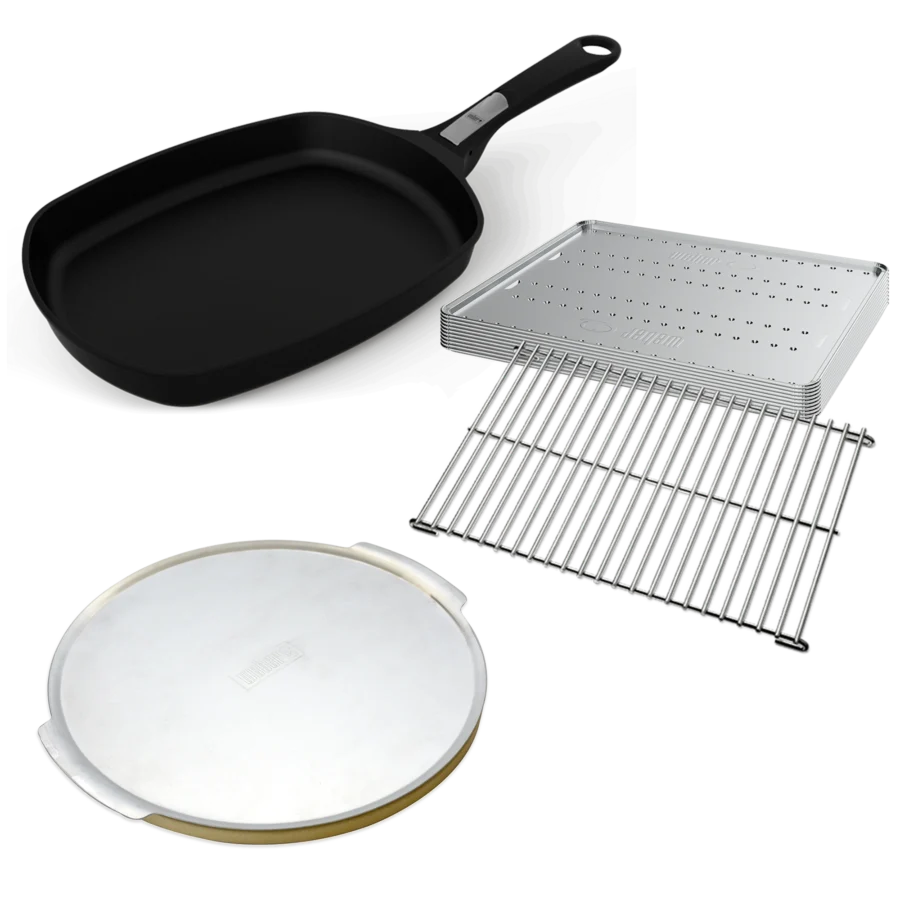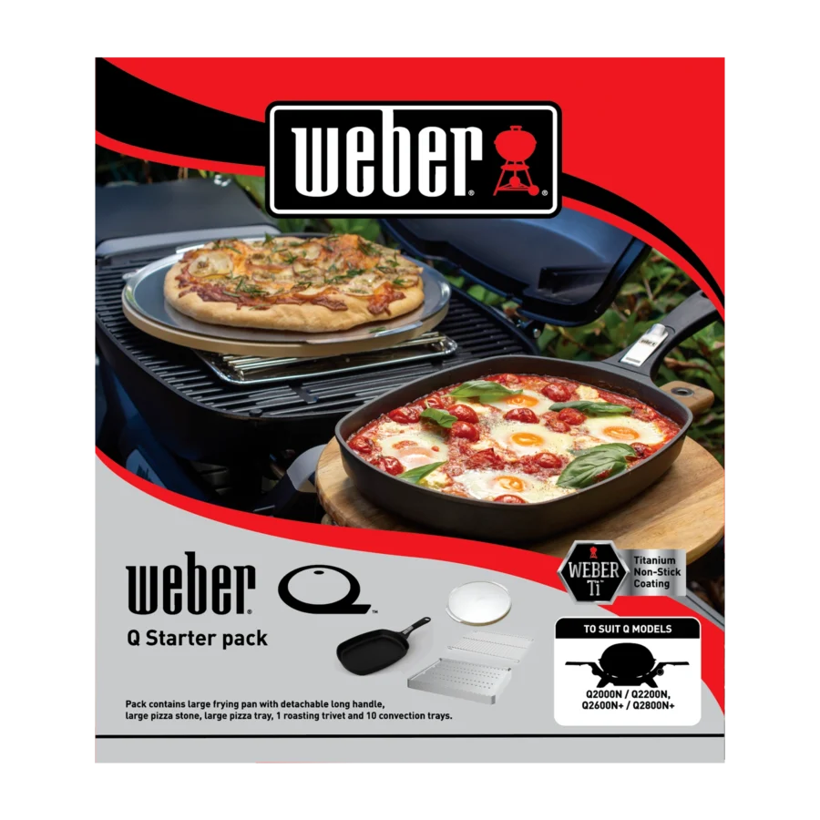 Explore a range of cooking possibilities with this starter pack for your Q barbecue. Whether you’re frying eggs and pancakes for breakfast, baking a brownie for morning tea, cooking up a pizza for lunch or roasting a chicken for dinner, this starter pack has all you need. This pack features a roasting trivet and 10 convection trays, a pizza stone with pizza tray and a frying pan with detachable handle – all specially designed and tested for use in your Q gas BBQ.